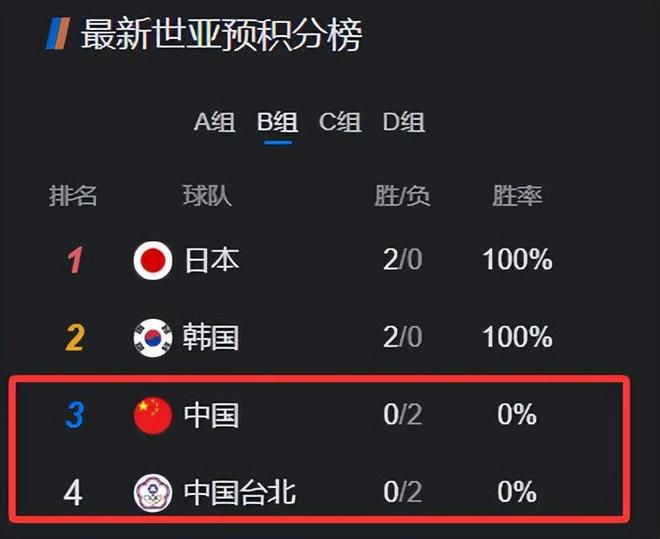 1)对日本两败,对中国台北一胜。同样要看韩国脸色,韩国能2—0中国台北,中国队就100%晋级。